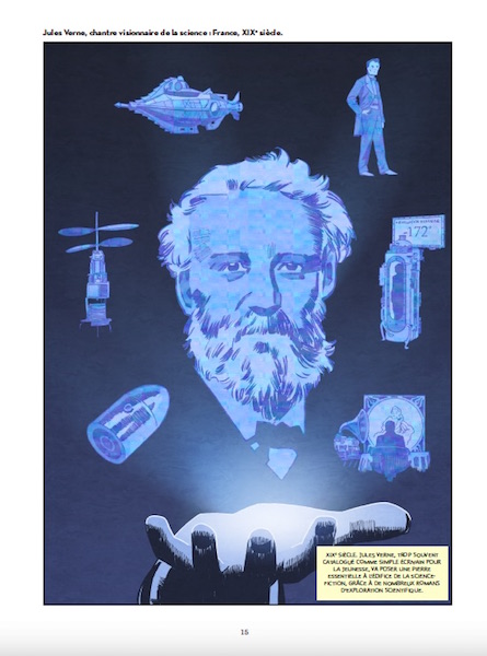 Écrire l’histoire de la science-fiction en bande dessinée est une idée qui pourrait paraitre à certains saugrenue, et pourtant il y en a des choses à dire, comme on s’en rend très vite compte à l’épaisseur du livre (plus de 200 pages). Ensuite quand on voit qui à écrit le scénario, on ne peut qu’avoir envie de se plonger dans cette bande dessinée puisqu’il s’agit de Xavier Dollo alias Thomas Geha, écrivain, libraire et aussi éditeur. Puis quand on feuillette rapidement le livre, on a envie de s’attarder sur chaque planche signée Djibril Morissette-Phan qui a entre autre réalisé Cryptomonnaie chez Dargaud. Alors plongeons dans cette Histoire de la science-fiction en bande dessinée en compagnie de 2 guides Xavier Dollo comme conteur et Djibril Morissette-Phan aux pinceaux.