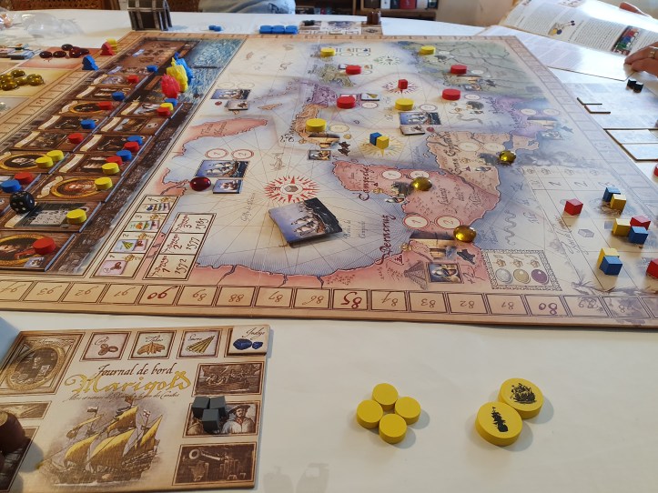 Francis Drake était un corsaire, explorateur et homme politique anglais du XVIe siècle qui effectua la troisième circumnavigation de la Terre entre 1577 et 1580. Mais c’est également le nom d’un jeu de société paru en 2013. Un jeu de placement d’ouvriers, assez long mais pas très compliqué et avec des mécanismes plutôt simples. Le jeu s’inspire bien sur de la vie de Francis Drake et les joueurs vont essayer d’imiter les exploits de ce dernier en montant 3 voyages dans la Mer des Caraïbes. Ils partent de Plymouth en Angleterre et doivent s’équiper avant de quitter le port avec de l’équipage, des canons, des bateaux et les réserves nécessaires. C’est assez tactique, intéressant avec un petit goût de reviens-y. Cela fait un peu penser à Caylus ou bien les phases de placement des Dungeon lords et petz, avec une part plus grande d’incertitude. Superbe matériel très costaud.