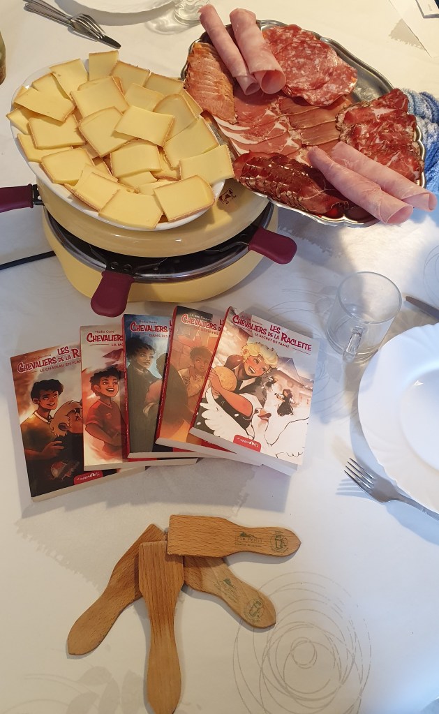 Je lis assez peu de romans jeunesse mais cette série a fait exception, pour ses deux auteurs d’abord, et ensuite parce que je lis ces romans avec mon fils. On les lit ensemble, ensuite il les relit tout seul. Pendant la lecture, on échange, il émet des hypothèses sur la suite, il rigole aussi souvent. Quand j’écris ma chronique, je lui demande ce qu’il en a pensé et lui fait relire. C’est notre lecture commune, et surtout un grand plaisir pour tous les 2. Les chevaliers de la raclette est une série jeunesse écrite à 4 mains par Jean-Laurent Del Socorro et Nadia Coste. Ce tome est le 5ème sur les 6 prévus. Jean-Laurent Del Socorro a écrit les tomes 1, 4 et 5 tandis que Nadia Coste s’est chargée des tomes 2 et 3 pour le moment.