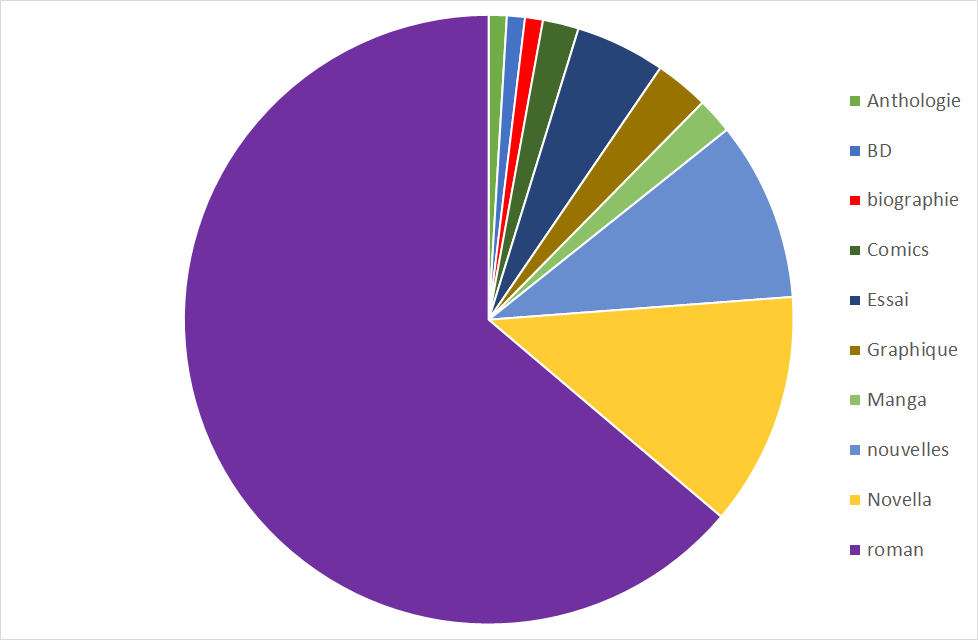 J’ai lu 104 ouvrages au total (romans, graphiques, novella, recueil…) contre 122 en 2021, répartis comme suit: