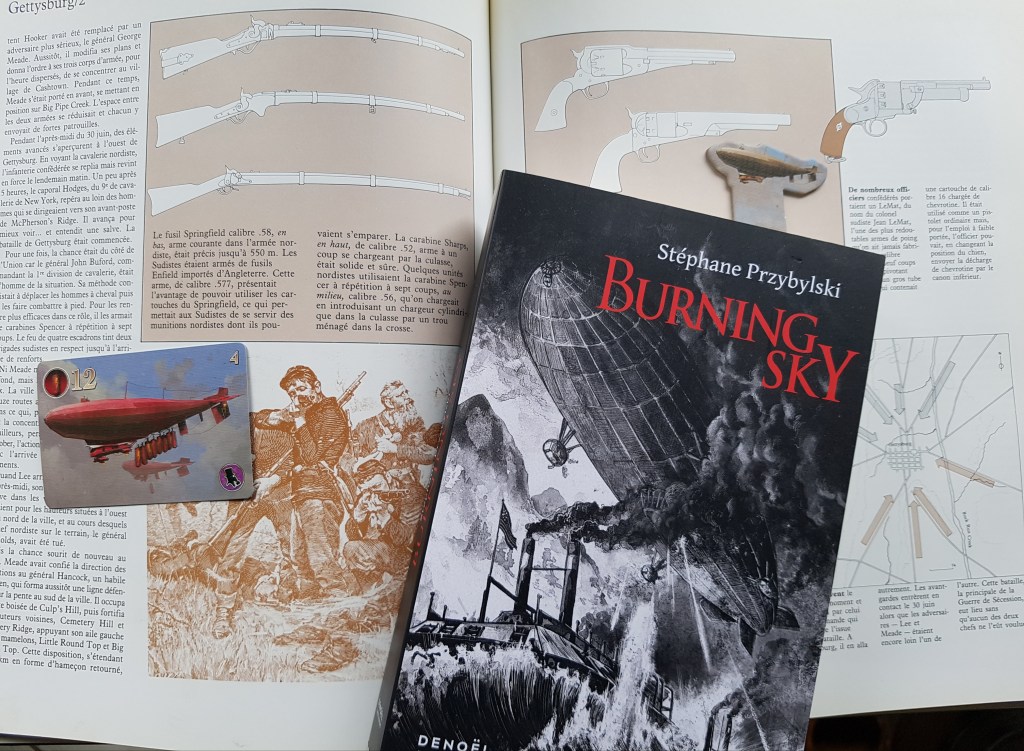 Après sa tétralogie des origines, revisite façon histoire secrète de la seconde guerre mondiale éditée chez Le Belial, Stéphane Przybylski revient avec une œuvre qui tient plus de la strictie uchronie, lors de la période de la guerre de sécession américaine : Burning sky, édité par Denoël collection Lunes d’encre.