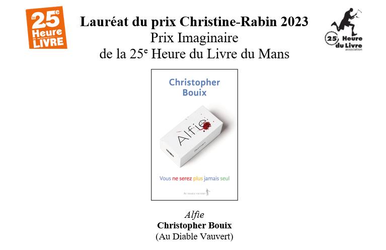 ֎ La 25e Heure du Livre a lieu en octobre au Mans. Depuis 2018 le prix Imaginaire y est décerné. Il récompense un roman francophone adulte relevant des genres science-fiction, fantasy ou fantastique. Le prix est doté de 500€. Le lauréat 2023 est le roman Alfie de Christopher Bouix, paru chez les éditions Au diable vauvert.