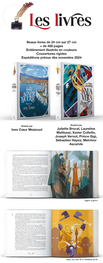 ֎ Les éditions Les Moutons électriques vont lancer une campagne sur Ulule à partir du 4 janvier 2024 et jusqu’au 28 janvier. Elle concernera la précommande pour une toute nouvelle édition illustrée de luxe de Gagner la guerre et Janua Vera & Sentiment du fer. En effet, en janvier, les Moutons électriques fêteront leurs 20 ans, et ce sera la sortie du dernier tome de la trilogie du Chevalier aux épines de Jean-Philippe Jaworski. Les livres seront en grand format 240*270 mm, reliés avec un signet et une couverture cartonnée, et richement illustrés à la manière des Harry Potter par Jim Kay ou À la croisée des mondes par Chris Wormell. Ines Cœur Mezzoud est la jeune illustratrice qui officiera intégralement sur Gagner la Guerre.